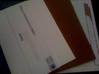 About a year ago, I bought my first BMW. The BMW was my dream car for this point in my life. It was a way to say, I've arrived, I've made it to where I want to be, and I'm successful. Says something about what the brand means, doesn't it? Anyway, I opened the package to see what was in it by pulling the strip on the back of the envelope (interesting side note...want a sure fire way to get someone to open something? Send it in a FedEx envelope or similar type of packaging...). Inside the package was a thick piece of cardboard to keep it from bending, and what looked like a white folder in a clear plastic wrapper. On the outside was a wrapper wishing me a Happy Anniversary from BMW. The message was simple, thank you for being a customer. Inside the little folder is a sketch of my car.